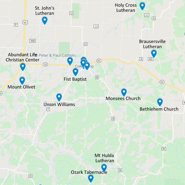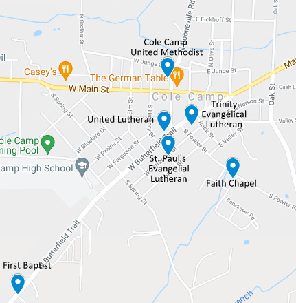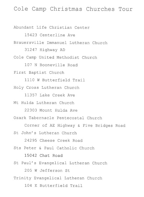 Cole Camp has been blest to have a number of churches in and out of the city limits. With the Christmas season coming quickly upon us, the Cole Camp Bicentennial Committee decided to use this special occasion to celebrate and highlight the many churches in our community.